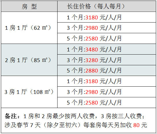 (2)以上价格1房1厅、2房1厅按2人入住收费;3房1厅按3人入住收费,如增加人数入住仅收60元/人/天(含一日三餐);
