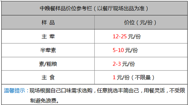 中晚晚餐:15个品种以上,现场根据自己需求自选自点形式购买。适合中晚餐自选消费:每餐有15个品种以上根据自己需求自由挑选刷卡消费。